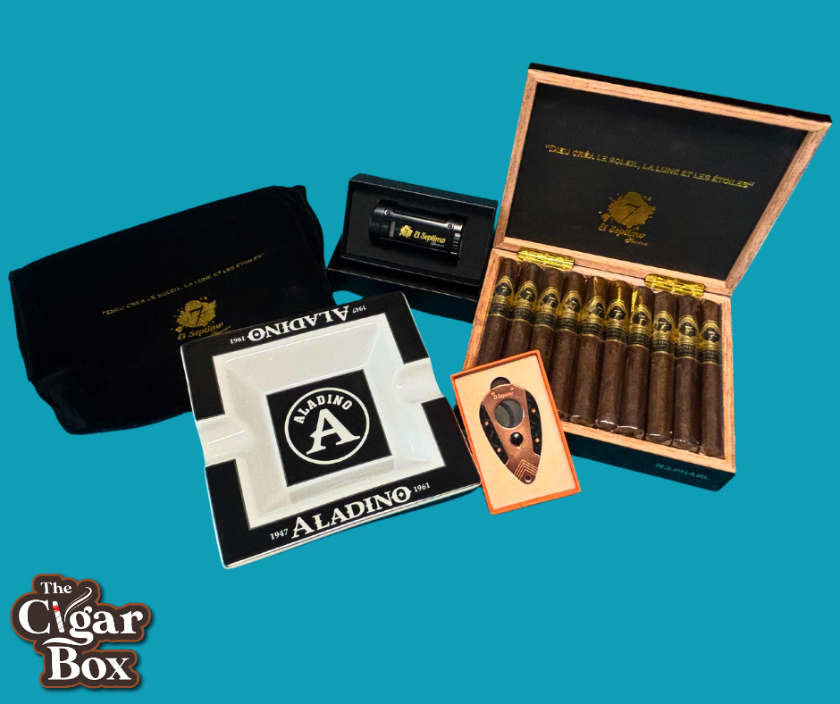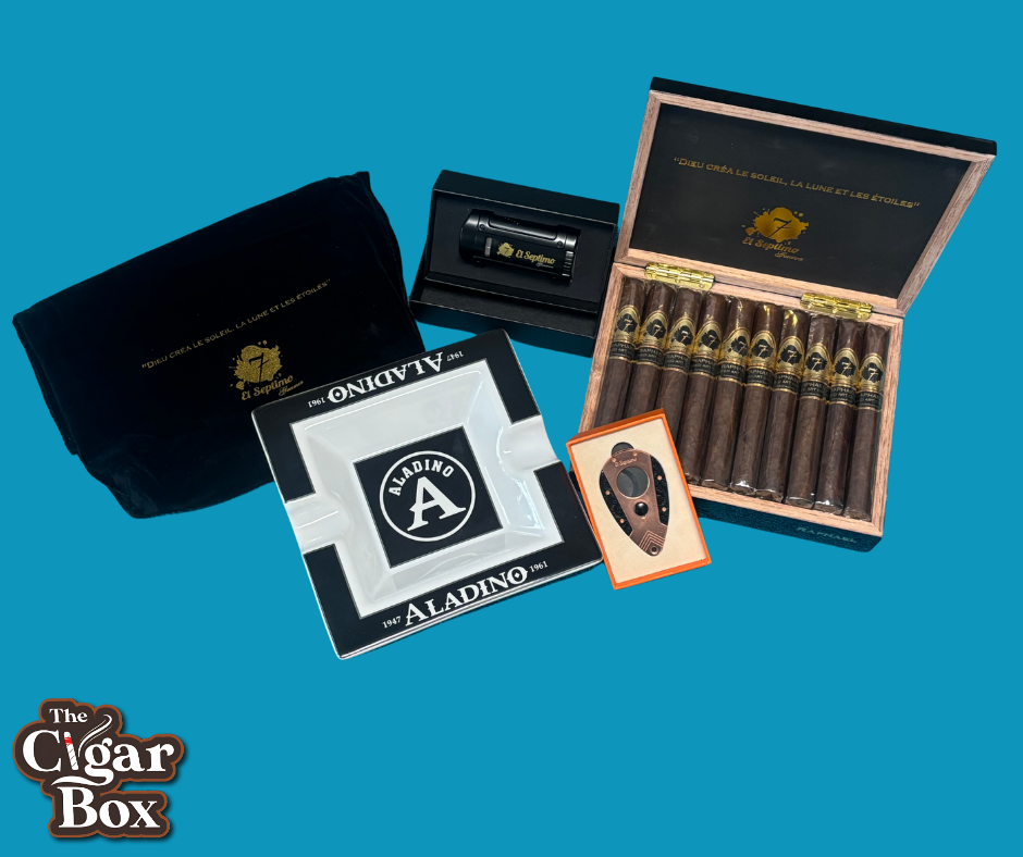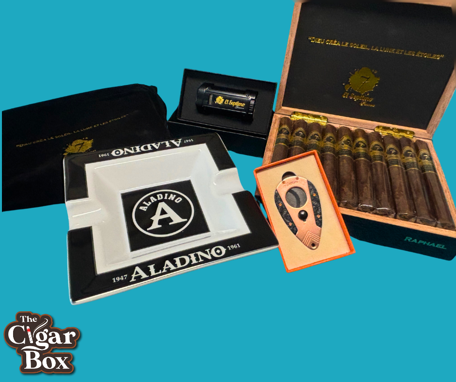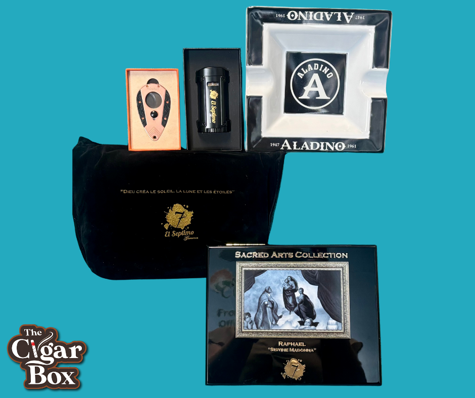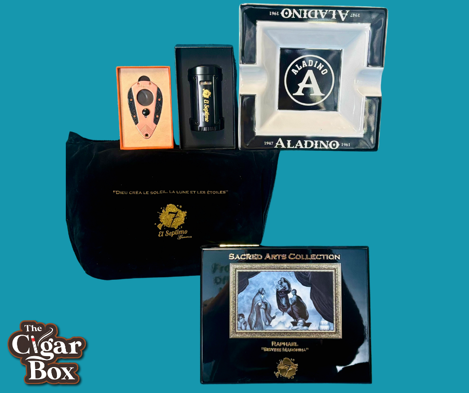 Check out this Amazing Set: *Box of 20 Premium cigars -Sacred Arts Cigar Collection- "Raphael" As elegant as the masterpieces of its namesake, the Raphael features a coppery, toothy wrapper and a flavor profile that is warm and inviting yet surprisingly bold. This robusto cigar transitions from notes of peanut oil and cocoa powder to a slightly bitter,over-roasted coffee tone, culminating in an herbal finish that lingers on the palate. Ideal for enthusiasts of herbal roasted cigars, the Raphael offers a satisfying experience for those who appreciate the nuances of an over-roasted coffee cigar. *El Septimo Double-Bladed Guillotine Cutter Made of copper and stainless steel, this El Septimo Cutter has a 57-ring gauge and even comes with a leather pouch to carry and protect your cutter in. *El Septimo Classic Quadruple Torch Lighter The windproof gas lighter is made of metal. It is refillable via the bottom inflator, as the clear viewing port allows customers to observe usage and gas levels at all times easily. The ergonomic handle offers smooth sides that fit comfortably in the hand, making the lighter easy to carry, as the blue flame burst offers a modern quartz-controlled electric ignition system that allows the flame to spray strongly, at high temperatures, and in a concentrated manner. This lighter doubles as a cigar holder, as cigars can be placed on the lighter between puffs. *Aladino Cigar Ashtray